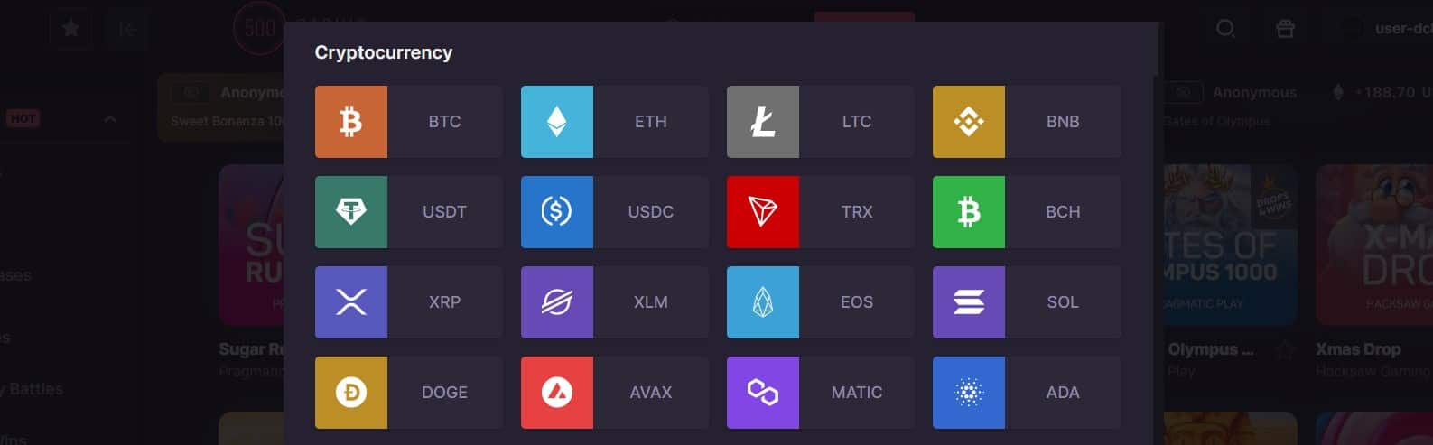 Despite primarily being a cryptocurrency casino, you are free to use fiat currency options at 500 Casino, like VISA, MasterCard, EcoPayz, Google Pay, Apple Pay, Skrill, and a few others to buy coins. These choices will shift depending on your accessing location, and know that the crypto purchases go through swapped.com. You can also use gift cards and CS2 skins.