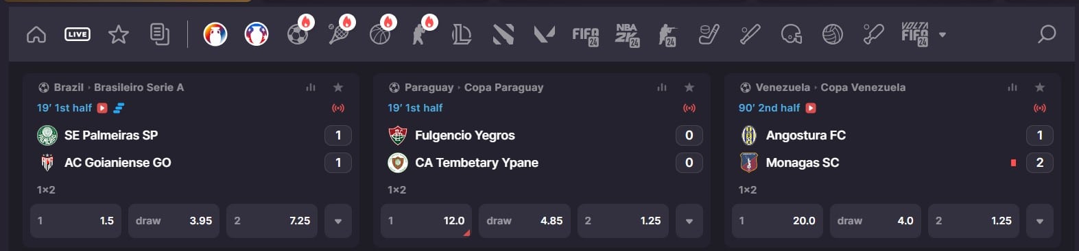 500 Casino implements the famous BETBY wagering software, which only features a left-side top sports selector. To get the detailed list of all the available options here, you need to click the down-pointing arrow, which will reveal the sports, eSports, and racing choices. The event selection below the top bar selection gets organized in a three-column grid.