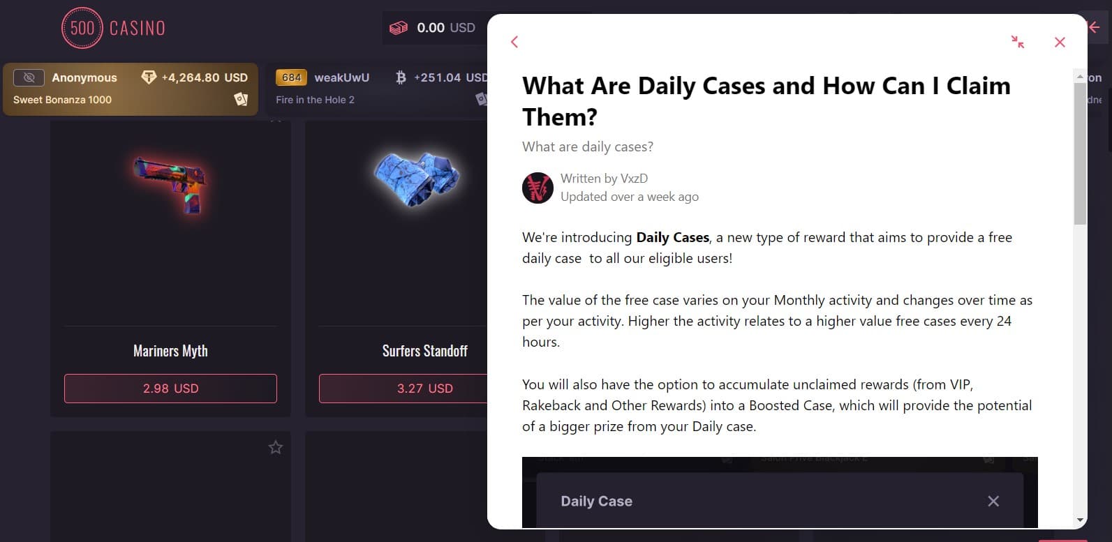 The 500 Casino affiliates scheme can deliver a commission between 10%-30% based on the casino advantage of the games your referred gamblers enjoy here. Lastly, we have cases, a new game mode featuring CS2 and Artifact-themed cases. Users above level 100 can create one case per 100 levels, earning 1.5% of the cash value as revenue. They can open up to four at once, and there are various case battle modes, including a Crazy one. A Provably fair system ensures transparency/fairness in this system.
