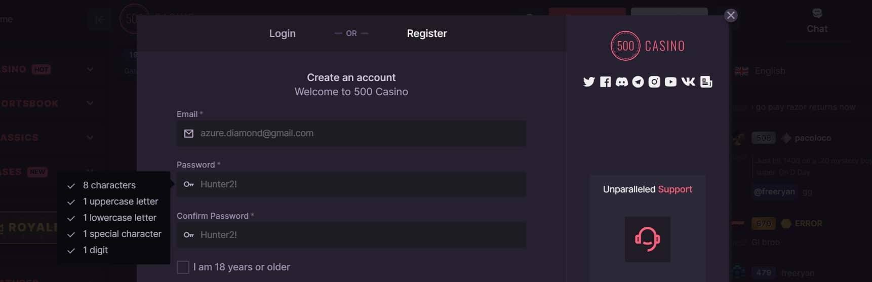 You can create an account with this crypto casino/sportsbook via a traditional route, where you register by inputting an email, entering a password, and accepting 500 Casino’s terms, privacy policy, and KYC rules. Alternatively, you can log into this site using your Google, Metamask, Telegram, and Discord credentials.