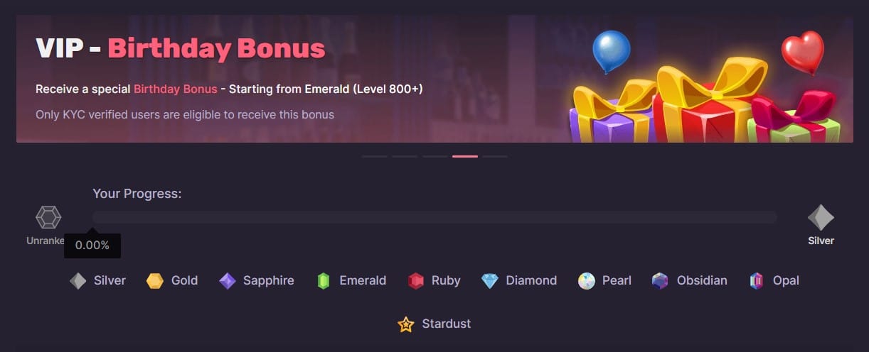 500 Casino’s VIP XP-collection scheme spans ten tiers, named after a precious stone. You begin in this program, working your way from Unranked through Silver, Gold, Sapphire, Emerald, Ruby, Diamond, Pearl, Obsidian, and Opal, and getting to Stardust, the final stage, will not be easy. There are ten thousand levels within these ten tiers. To discover how much XP you need to claim to get to a desired level, visit the XP calculator page that breaks down the point calculation on in-house games, third-party ones, and betting fun.