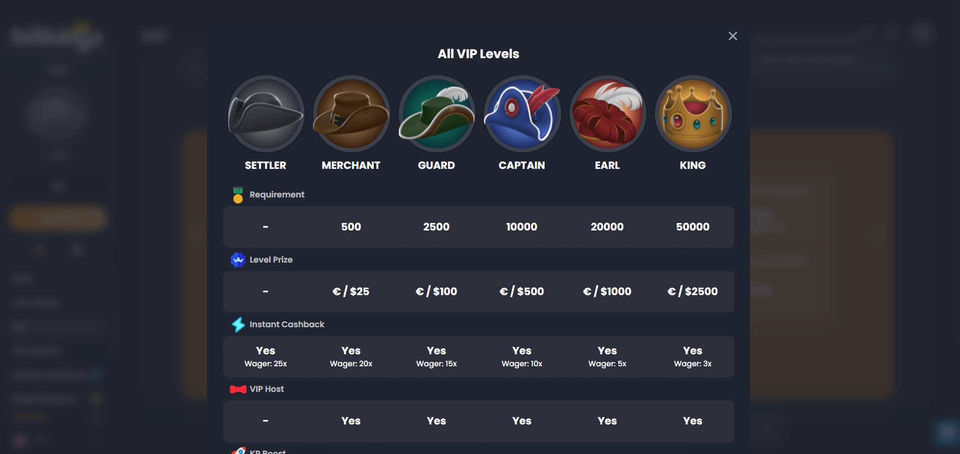 The Instant Cashback given out in the VIP scheme has a wagering requirement, which varies depending on your level, from x25 for Stellar-rank users to x3 for Kings.