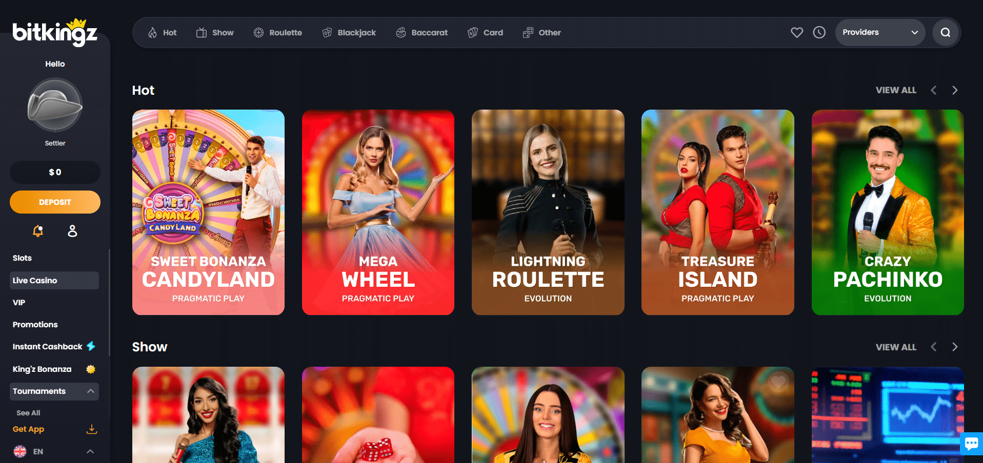 The live casino section has these groups – Hot, Show, Roulette, Blackjack, Baccarat, Card, and Other.