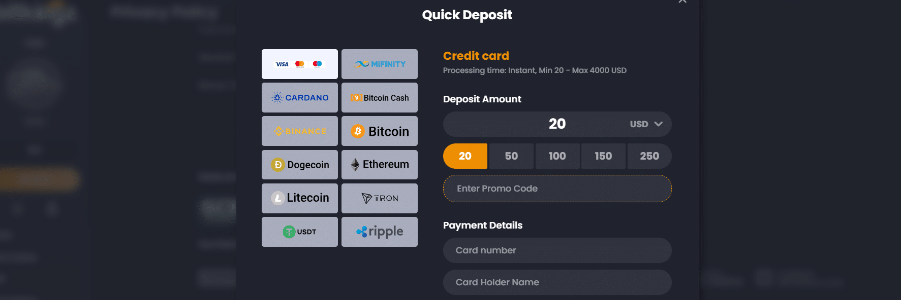 The staff told us we can pay with fiat currency and receive money in cryptocurrencies. On the deposit page, we must select the preferred deposit currency. For example, select VISA and cryptocurrency on the right, and pay with fiat and get crypto.