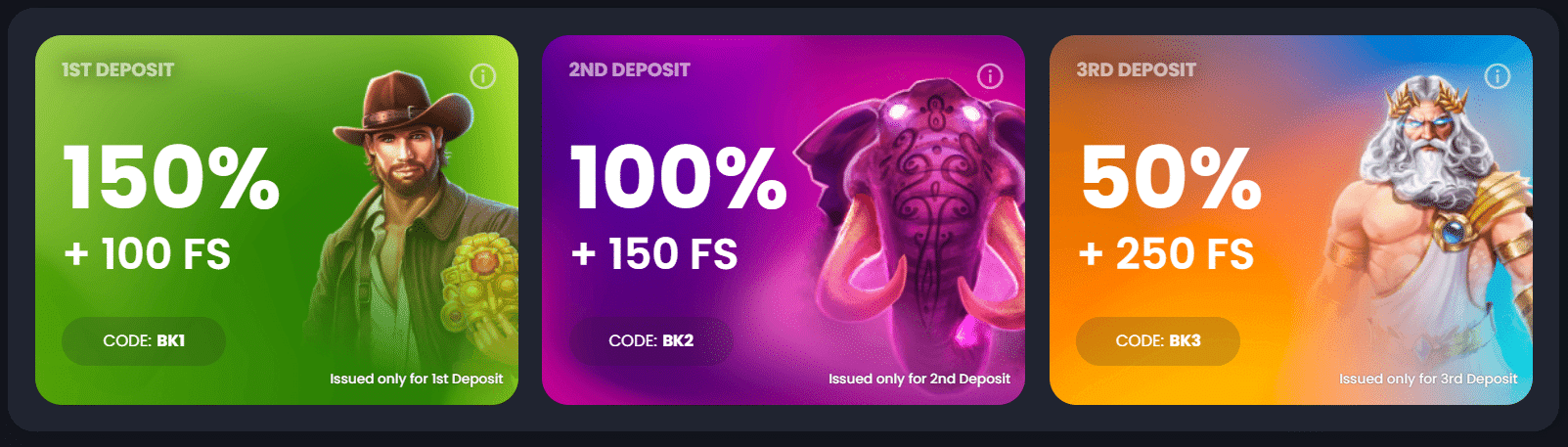 The site welcomes novel users with a three-pack offer. On your first deposit here, you can get a 150% match up to €1,000 plus one hundred spins (fifty per day for two days) on John Hunter and the Mayan Gods. You must use the code BK1 and deposit at least €20. The second time you fund your BitKingz balance, you can get a 100% match up to €1,500 with one hundred and fifty spins, given out in batches of fifty per day on Pink Elephants. The code here is BK2, and the minimum deposit is again €20. That is the same amount needed for the third deposit bonus of 50% up to €2,500 coupled with two hundred and fifty spins on Gates of Olympus. Again, these gratis gaming rounds get given out fifty per day, and to access this promo, you need to input BK3 while depositing.