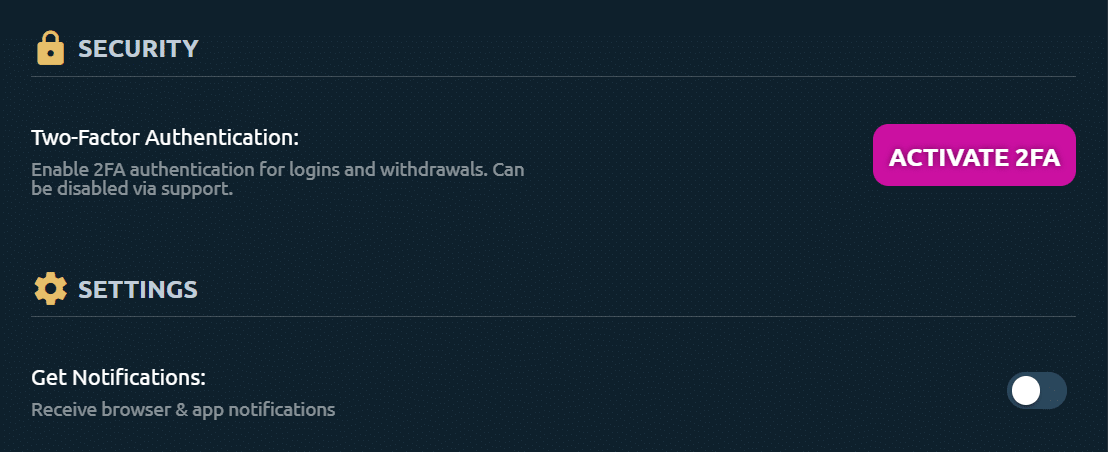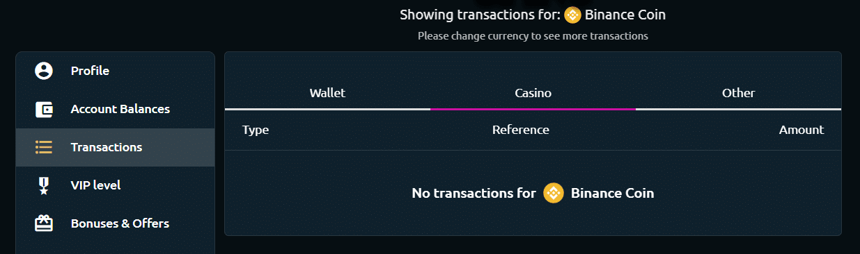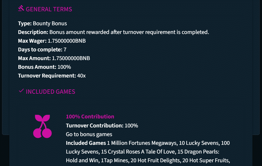 Since there is essentially only one real bonus here, we would say the terms for it are clearly enough defined. What we found strange is that on the page for the welcome bonus terms, there is missing info, as no max bet amount and game contribution rates get listed there. Yet, if you access the Bonus & Offers tab in your profile, you will see these terms there. Also, here, the bonus values get expressed in BNB, while on the promotions page, they are in USD / EUR. We thought this was odd.