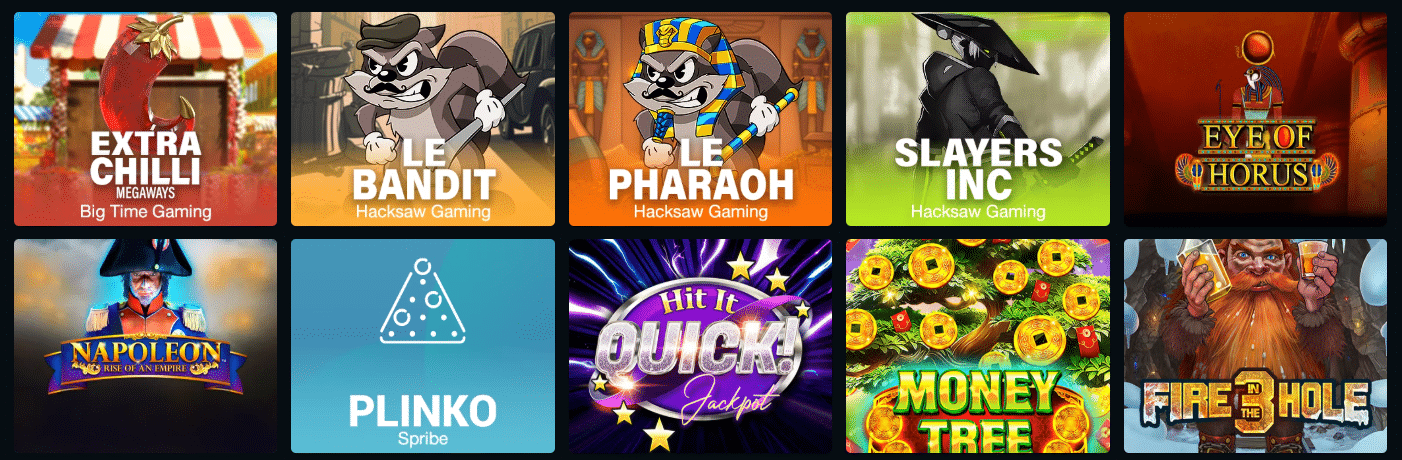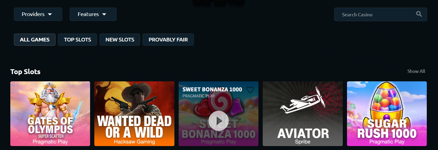 You can play multiple Spribe titles here: Mines, Plinko, Hilo, Dice, Keno, Mini Roulette, Hotline, Goal, Aviator, and Blackjack. The site also has a decent collection of provably fair-style products from other providers famed for these types of games, such as Turbo Games and Smartsoft Gaming.