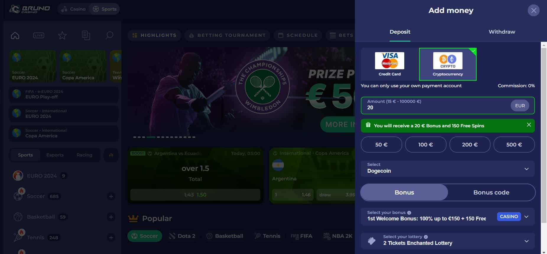 Although technically a crypto casino, Bruno does not seem overly enthusiastic about making everything as crypto-friendly as possible. The site lists all its limits in Euros and makes no effort to clarify specific aspects of crypto-related transfers.