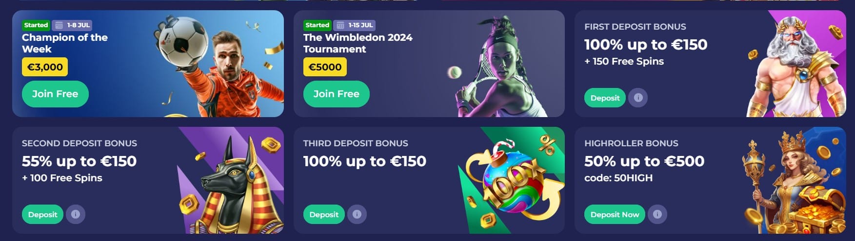 High-rollers on this platform get treated to a 50% match up to €500 through the use of the code 50HIGH. That is a deal that comes with an x35 rollover, and a three-day lifetime.