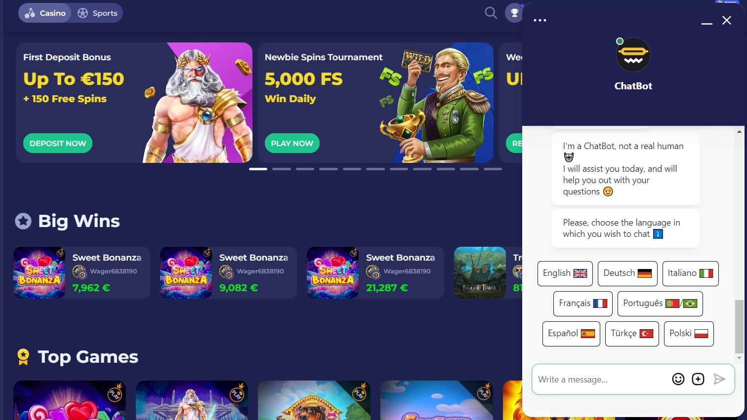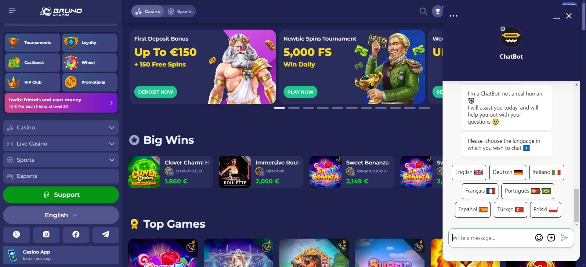 Don’t let its name fool you – Bruno Casino does support sports betting. It has a premium BETBY sportsbook.