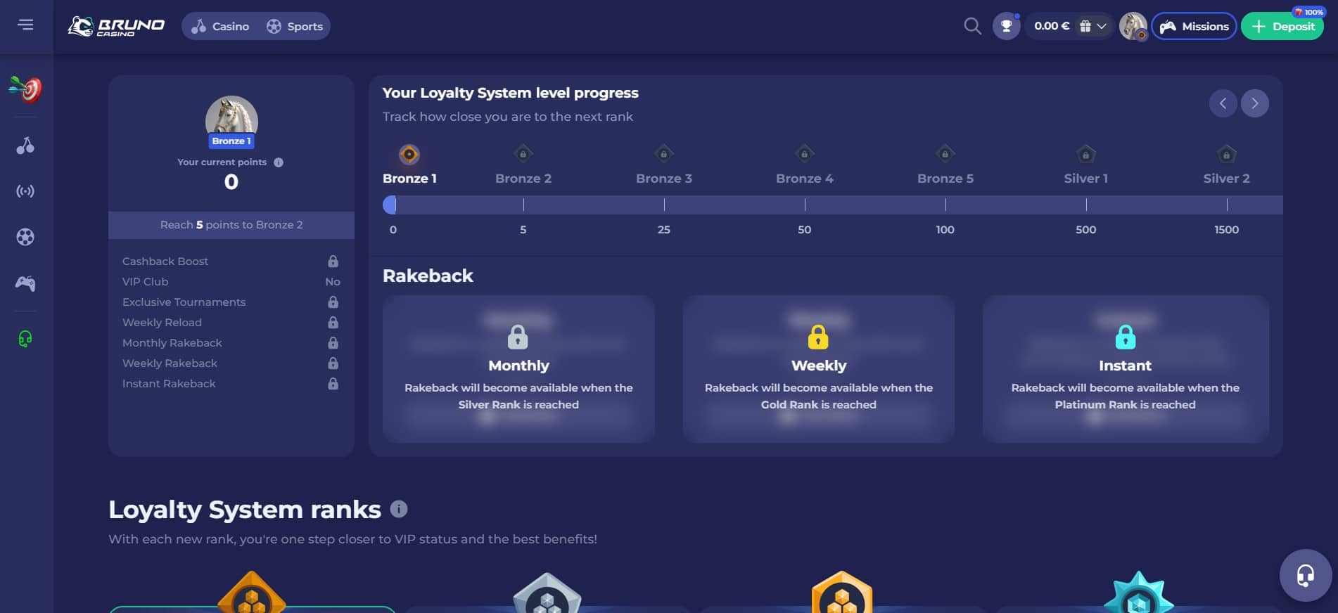 The Bruno Casino Loyalty Program is a point-collection one. You start in this system at the Bronze 1 rank, and you earn Comp Points (CP) at a rate of one for every €20 bet. The ranks in this program go up to Platinum, which requires 3,000,000 CPs, each offering better rewards than the previous. These are cashback boosts, access to VIP clubs, exclusive tournaments, and various forms of Rakeback (up to 17%).
