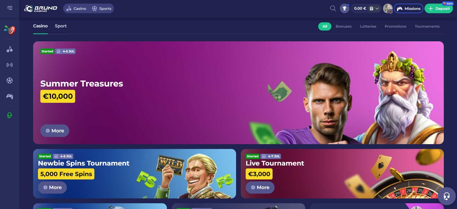 Bruno Casino utilizes the same design style as its sister sites, meaning the other platforms in Dux Group’s fold. It has a dull blue background color, relying on saturated vibrant images for contrast. The organizational structure here is what you would expect from a reputable online casino that tries to keep things simple yet pleasing to the eye via a top bar and a left-side menu.