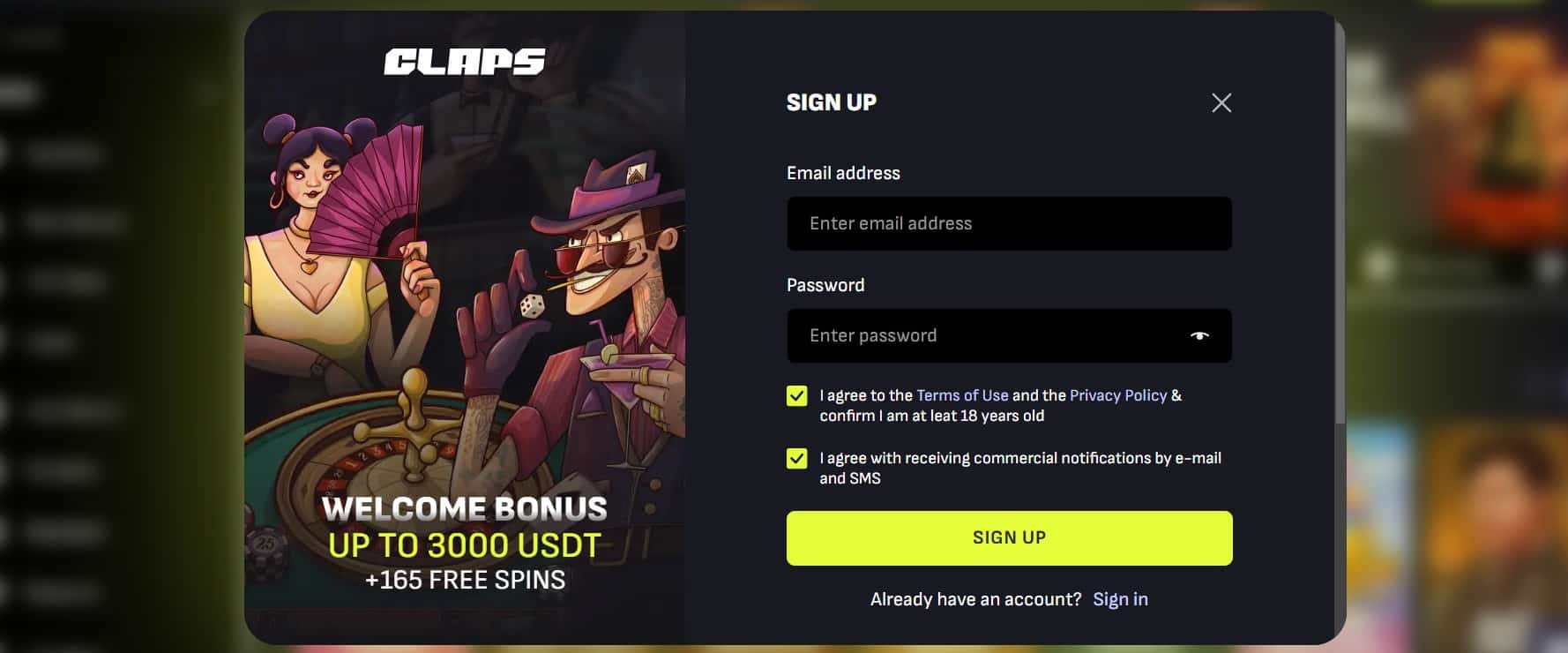 To join this platform, you need to hit the yellow Sign Up button on the home page, which will take you to a page that will demand that you enter your email address and choose a password. You will also have to agree to the site terms before you are able to become a Claps member.