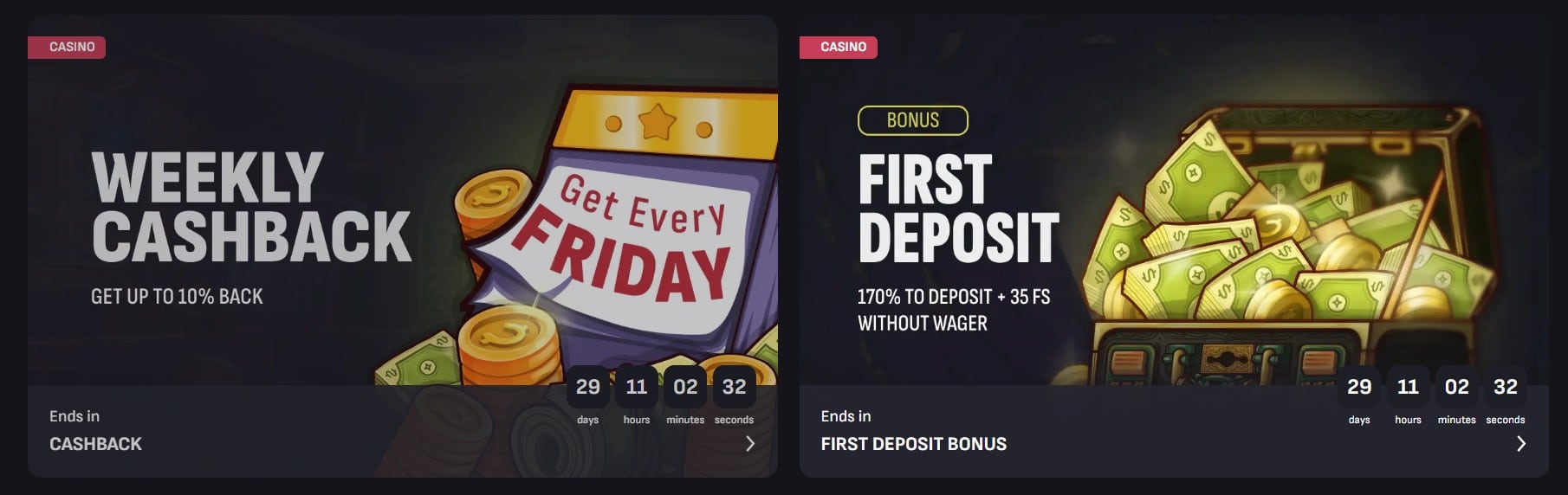 The Claps Welcome Package is a four-part deal that consists of four deposit matches. On your first deposit here, of 10 USDT or over, which is a general rule (deposit minimum) applicable to all four parts of this package, you get a 170% bonus up to 1,000 USDT paired with thirty-five free spins that come with no wagering requirements. The promo amount given has an x35 rollover attached. The bonus has a two-day activation period, a five-day wager period, and a seven-day validity. There is a 0.2 USDT bet minimum stipulation as well.
