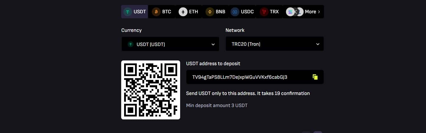 - Deposit Options USDT, BTC, ETH, BNB, USDC, TRX, SOL, XRP, LTC, DOGE, BCH, ADA