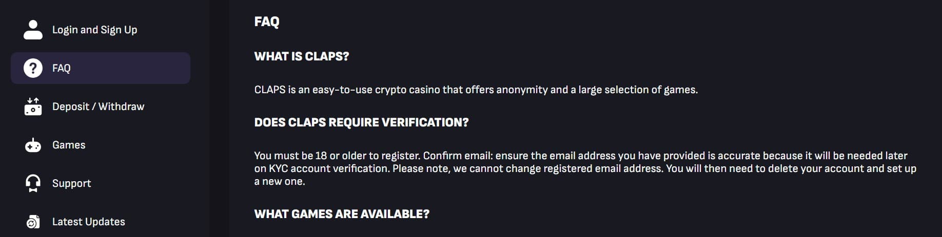 The mentioned Help Center page has the following categories – Login and Sign Up, FAQ, Deposit / Withdraw, Games, Support, Latest Updates, Promotions, Getting Started, Verification Process, Welcome Bonuses, First-Time User Guide, Account Management, Payments, and Licensing Information. Unfortunately, most of these are pretty bare and only contain super basic info about their related topics.