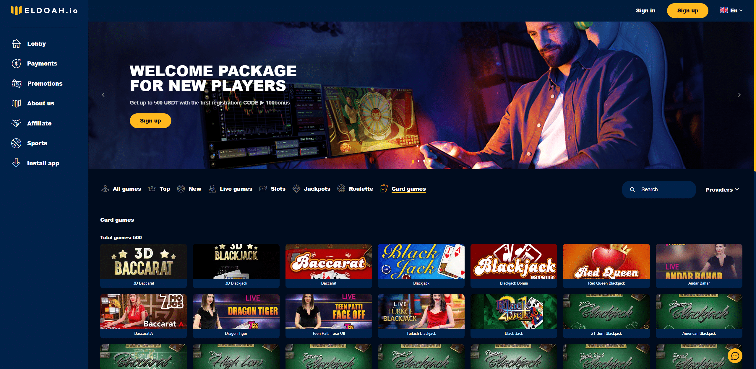 Eldoah.io incorporates the traditional online casino setup. We believe this is probably a SoftSwiss gaming site solution and implements the classic saturated yellow and blue color scheme. Navigation is available via a left-side vertical menu and through links in the homepage footer. Overall, we have no major gripes about Eldoah.io’s presentation.