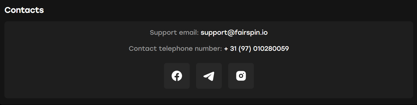 Fairspin offers phone support at +31 (97) 010280059, which is something we seldom see at Bitcoin casinos. Its aid email is support@fairspin.io, which we tested and got a reply through this help avenue in an hour. You apparently can also ask for help using this brand’s social media profiles and drop a question on its official Telegram channel.