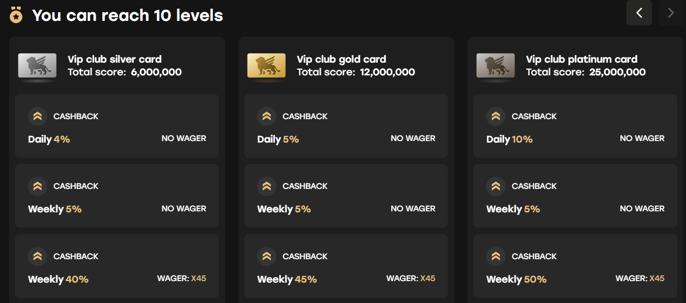 Cashback is a loyalty system-connected promo here, as explained below. We will tell you that all site users here do receive a base weekly cashback of 5% with no wagering requirements.