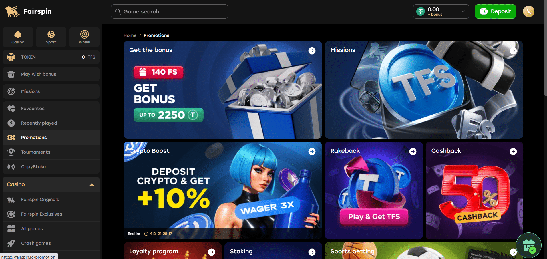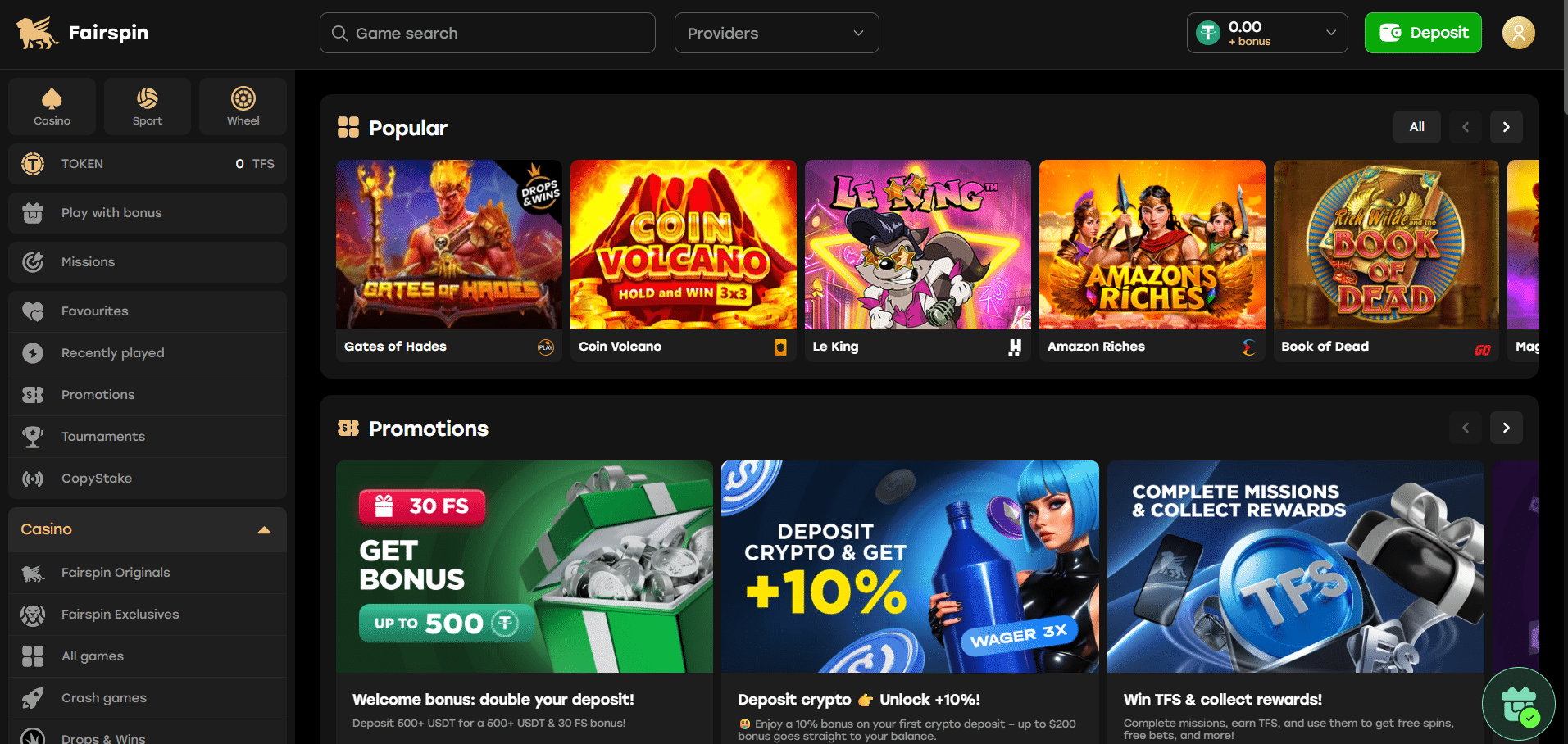 Fairspin has a token that facilitates its Play to Earn and Hold to Earn mechanisms, which are one of its main selling points. The platform entices online gamblers from around the globe to join it via a gaming library that is likely ten thousand titles strong, a Betsy Games betting page, a hefty up to 400,000 USDT welcome pack, a multi-faced interface, and accepts a decent range of cryptos and some fiat transaction options.