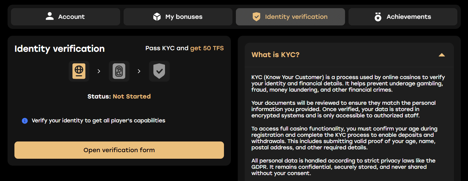 Pretty much none. You cannot use a VPN here, and you will have to go through the Fairspin KYC identity verification process fairly quickly here. The platform also notes that it can try to verify your location/identity via phone calls or Sum&Substance, a third-party service. Accordingly, this is not a hub for someone wanting to conceal their real-world identity from their chosen operator and government authorities.