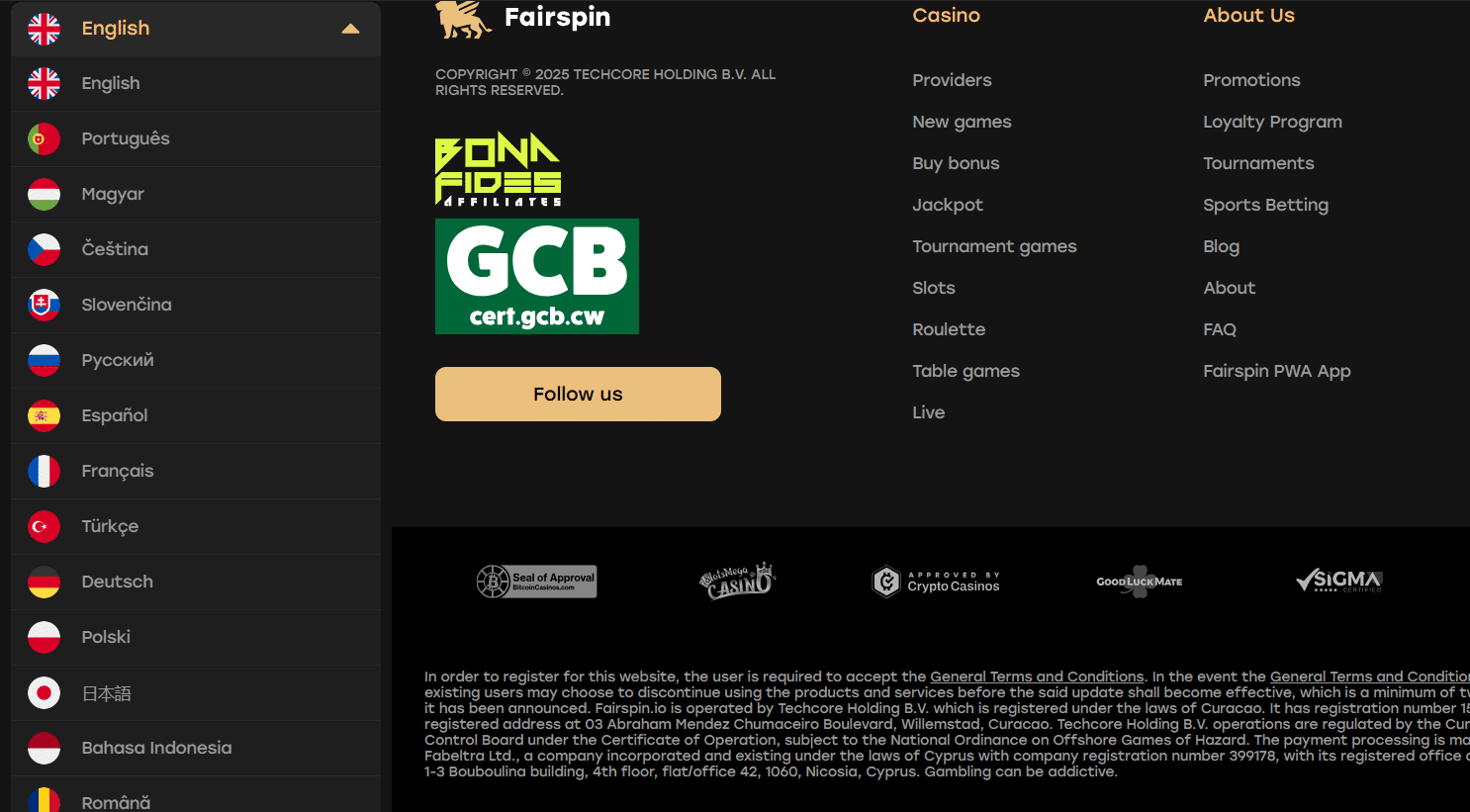 Techcore Holding B.V., the operator of Fairspin, owns and manages one more site, that is Betico Casino, which got launched in 2026. It is a similar but more basic platform compared to this one.