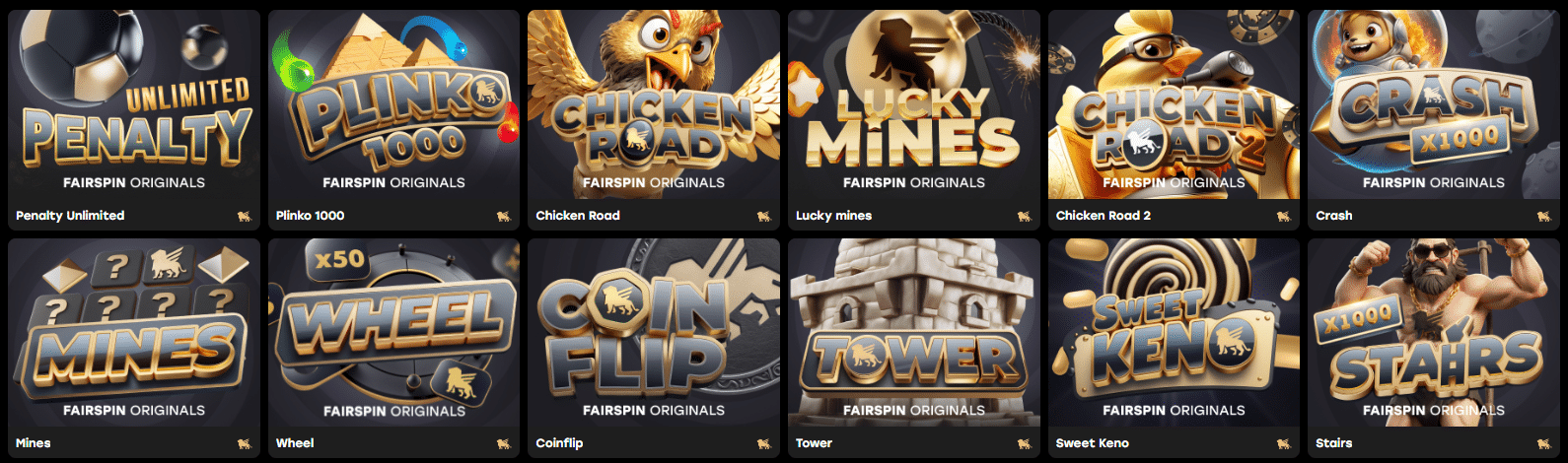 Penalty Unlimited, Plinko 1000, Chicken Road, Lucky Mines, Chicken Road 2, Crash, Mines, Wheel, Coinflip, Tower, Sweet Keno, Stairs, Bubbles, Triple, Limbo, Cryptos, Joker Poker, Aviafly, Goblin Tower, Hot Mines, Diver, Robo Dice, New Double, New Hilo, Jogo Do Bicho, Roulette, Hamster Run, and Forest Fortune are Fairspin’s Original titles.