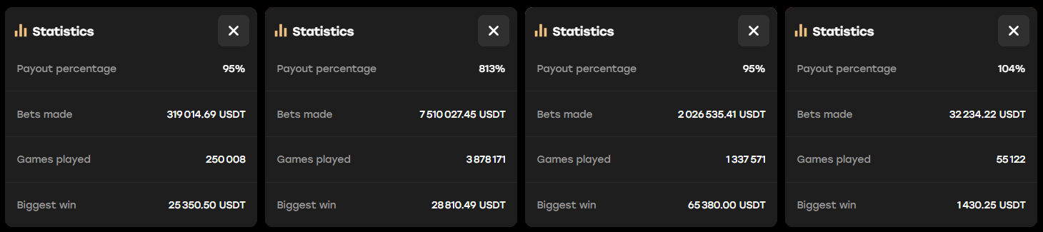 Not really. But each game graphic in the Fairspin lobby has a chart icon in its top right corner, which, when you press it, will pop up Statistics info. For instance, we did this for Play’n GO’s Book of Dead and got the following data – Payout percentage: 5555%, Bets made: 2,943,291.93 USDT, Games played: 6,066,527, Biggest win: 7,745.41 USDT. We assume this is platform-related data for this game.