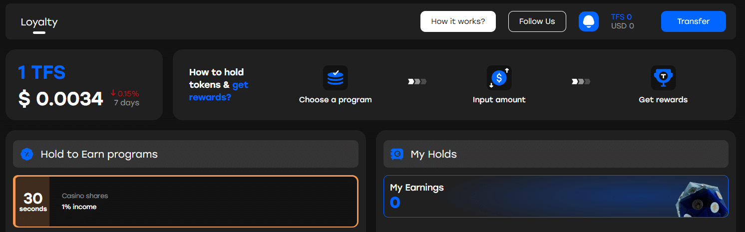 In Play to Earn, you get loyalty tokens as Rakeback for every bet placed. Their number depends on the bet, a game-specific coefficient, and a fixed exchange rate. The latter is 1 TFS = 0.0035 USD. Bonus funds do not qualify for Play to Earn rewards. The earned tokens can be withdrawn or used for staking in the Hold to Earn program.