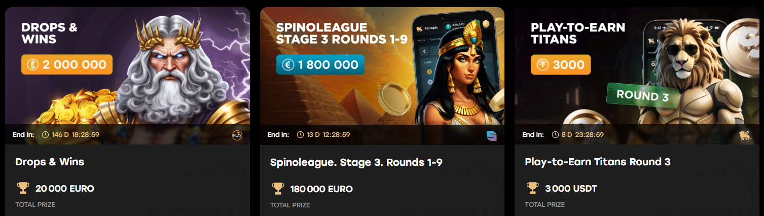 Fairspin works with providers like Pragmatic Play, 3 Oaks Gaming, Spinomenal and others to bring users their competitions here, but it also runs its own, where rewards usually get given out in native tokens.