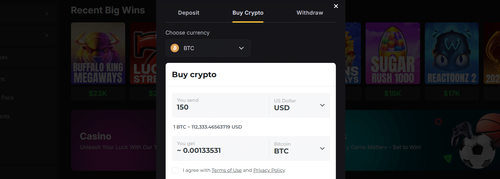 - Deposit Options BTC, LTC, DOGE, ETH, USDT, TRX, DASH, BNB, USDC, MATIC, SOL