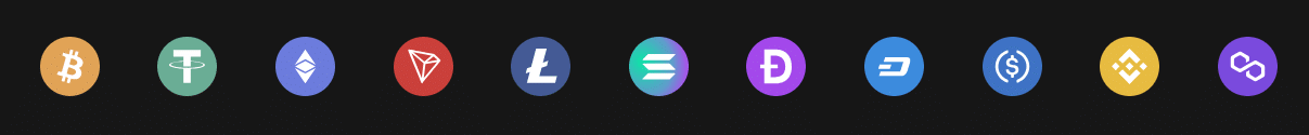 You can utilize Bitcoin, Ethereum, Tether, Binance Coin, Solana, Litecoin, Tron, USD Coin, Dogecoin, Polygon, and DASH.