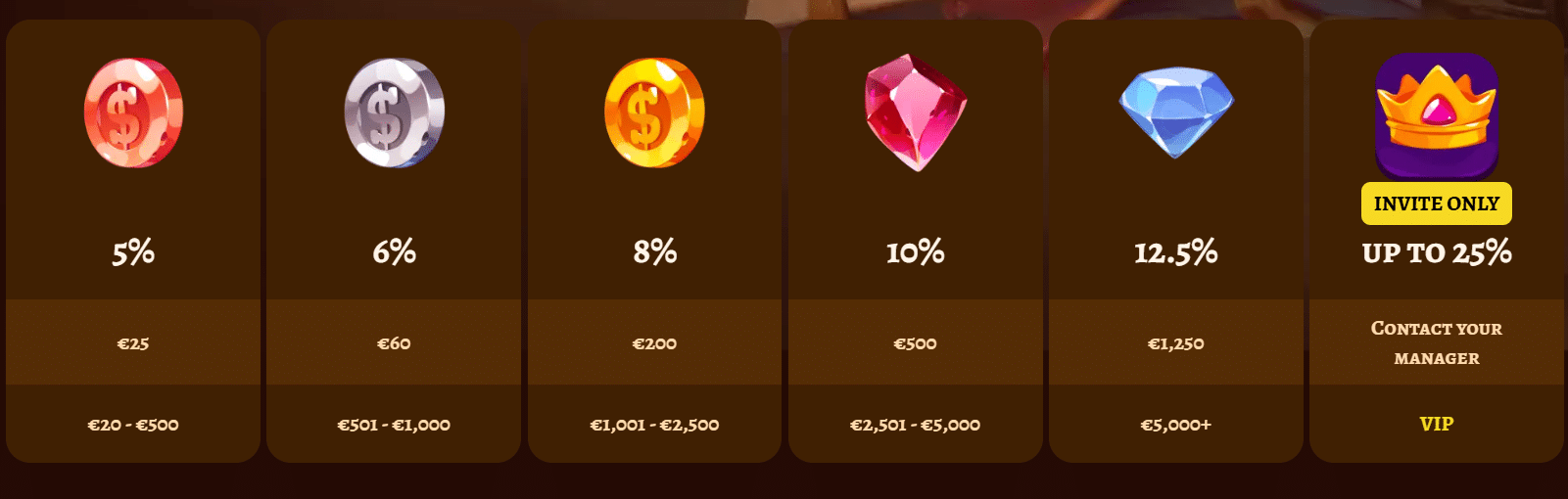 The perks that lie in this scheme are bonus rewards, cashback, access to exclusive tournaments, VIP manager, improved withdrawal limits, and Rakeback in different forms. For example, at the Bronze stage, you get limited perks, up to one hundred free spins. In the Silver one, you receive up to €105 in bonus rewards and a 1% cashback boost. In the Platinum tier, the benefits ramp up to €10,000 in bonuses, 5% monthly and weekly Rakeback, and 8% instant Rakeback.