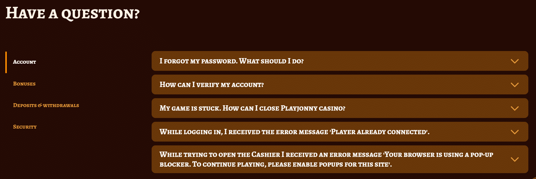 The help email here is support_cr@playjonny.com, and we got assistance through it in less than an hour. The PlayJonny FAQ is accessible via the homepage footer. It has four sections and eighteen FAQs in total, most of which are pretty useless.