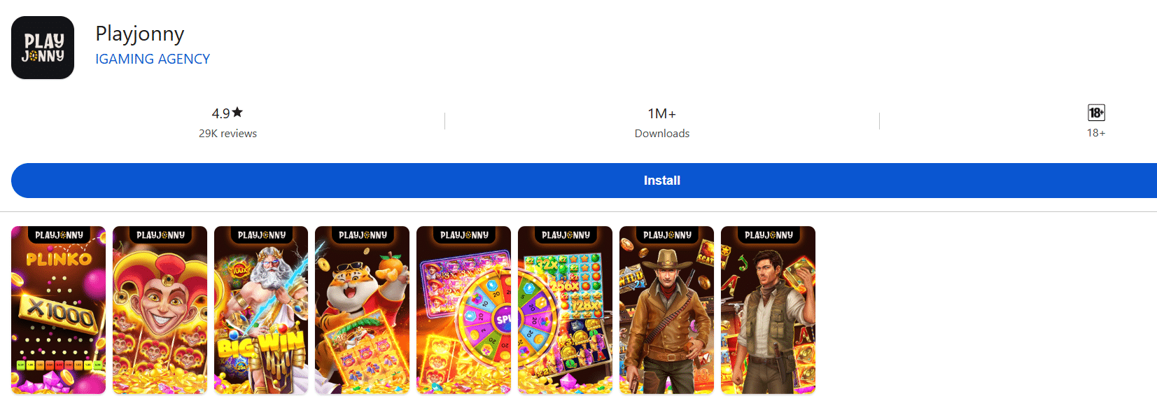 There is a PlayJonny app, and we think we saw promises for extra bonuses if you install it. We did not do this for two reasons. The first is that we did not have a VPN on our phone, so we had to test the PlayJonny mobile version through a desktop smartphone simulator, and the second is that when we clicked the Casino App link, we got redirected to a Google Play-like page. This was a page on the PlayJonny website made to look like GooglePlay, where it said that this casino app had over a million downloads and around twenty-nine thousand reviews. Yes, that is entirely possible for a brand with one X follower!