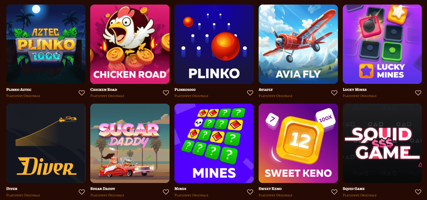 There are twenty-eight so-called PlayJonny Originals. They are – Plinko Aztec, Chicken Road, Plinko1000, Aviafly, Lucky Mines, Diver, Sugar Daddy, Mines, Sweet Keno, Squid Game, Stairs, Limbo, Joker Poker, Bubbles, Coinflip, Jogo Do Bicho, Triple, Tower, AviatriX, Wheel, Hilo, Crypto, Hot Mines, Robo Dice, Goblin Tower, Double, Roulette, and Hamster Run.