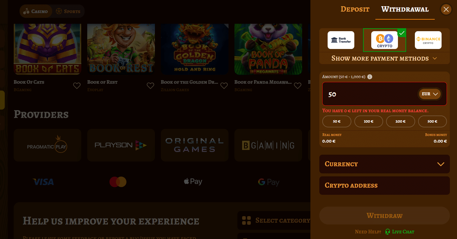 What we have here is an untested player that recently launched. It is not a looker, and its presentation turned us off a bit, if we are keeping everything 100%. It does have a good game library, supports fiat and cryptocurrencies, and has a decent welcome package with x35 wagering. Plus, an up to €450 offer for bettors with x5 wagering.