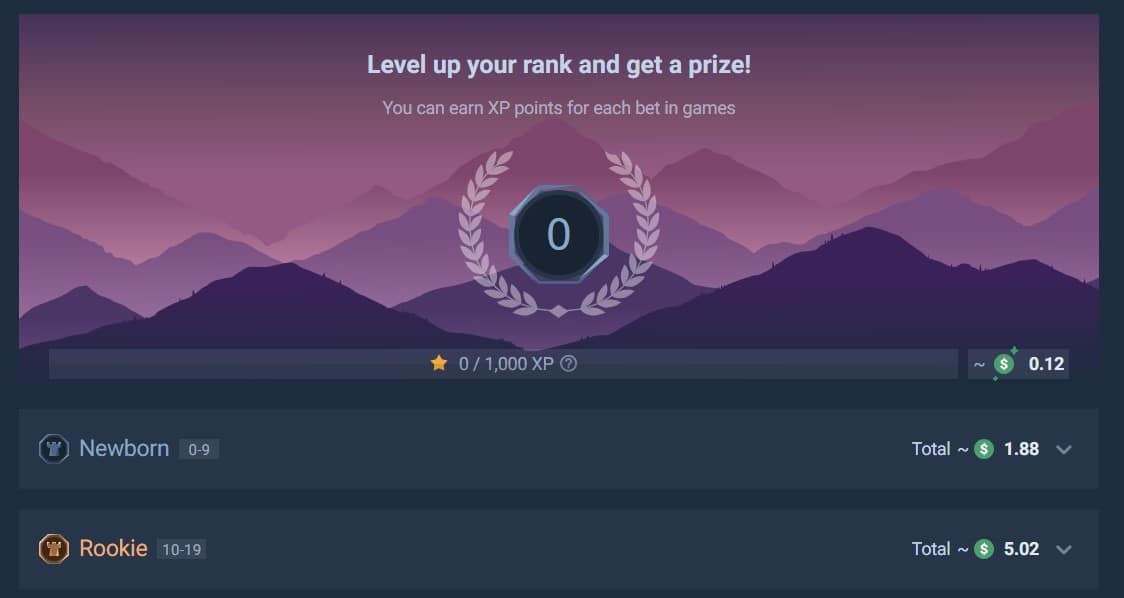 So, where do we stand on a Tower.bet VIP program? You get a point-collection one that has been running since this site went live. That said, it is slightly different today, but it still lets you earn Experience Points (XPs) through your site gameplay and progress through six main ranks. These are Newborn, Rookie, Amateur, Advanced, Pro, Master, and Overlord, totaling 59 levels. Each level grants better rewards than the one before it, and you accumulate XPs at varying rates depending on what games you played. Minimum bets for earning XPs differ by game type. They start at 0.01 USD for slots and hi-lo, up to 0.05 USD for non-in-house or third-party games, which Tower.bet calls Externals. The thing we like about this program is that once you achieve a level, you cannot lose it. It is permanent. Many platforms now use loyalty systems where the levels reset every month or every three.