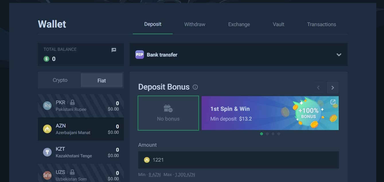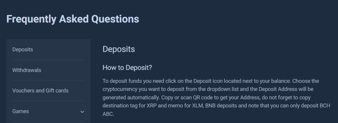 Some cryptos here have no deposit minimums, but you do get ones for others. Bitcoin has a – 0.0000551 BTC limit and Ethereum has a 0.00157974 ETH one. From what we can tell, most coins look to have a $5 equivalent limit. There are no deposit maximums. As far as withdrawal minimums go, you have – 0.0003004 BTC, 20 USDT, 50 DOGE, 0.248 LTC, 27 XRP, and 0.006988 ETH. You will get charged a withdrawal fee for each withdrawal, which will depend on the speed at which you wish your transfer to go.