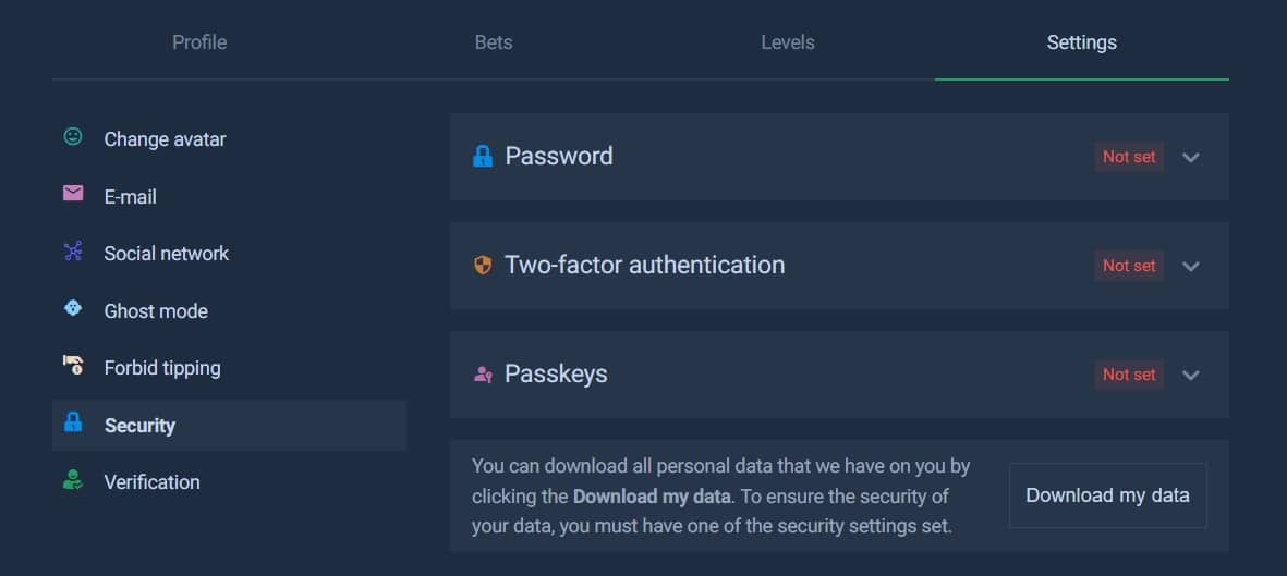 You can activate 2FA in your profile’s settings tab, where a ghost mode is also available, but we saw no responsible gambling tools there.