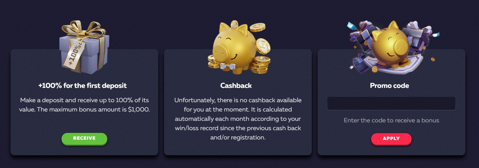 Vavada seems to like to keep things simple on the promo front. It supplies a 100% match up to $1,000 as a welcome bonus and gives away free spins—one hundred active for two weeks after sign-up—on the game The Dog House by Pragmatic Play. It also gives away cashback, which we will tell you more about below, and can supply distinct bonuses, but only if you have a promo code for these.