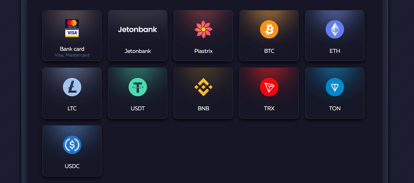 The cryptos you can use here are Bitcoin, Ethereum, Tron, Binance Coin, Tether, Litecoin, Toncoin, and USD Coin.