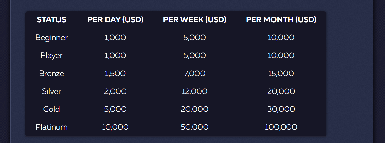 You will see below that different statuses generate different payout limits here—daily, weekly, and monthly ones. We asked the site team if they give out something else to higher-end status players, like, at least personal support and tailored bonuses, but they said – no, and ended the chat.