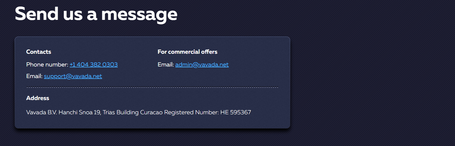 Per the “Send us a message” page, you have Vavada phone assistance, which yo u can reach by calling +1 404 382 0303. For commercial offers and self-exclusion, you should reach out to the Vavada team at admin@vavada.net, and for general email help, the address is support@vavada.net. We used the latter and got a reply in our inbox in around forty minutes, which featured some Cyrillic letters. We assume the text was something in Russian, as this brand has a heavy presence in Russia and caters to gamblers from that nation a lot.