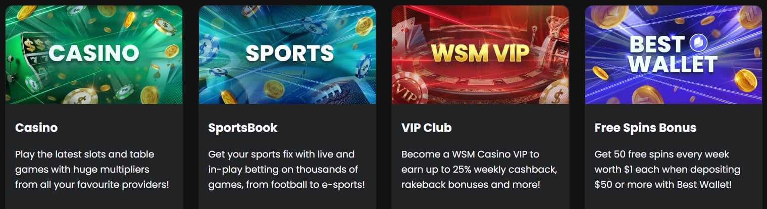 If you have been around crypto sportsbooks, you probably will be super familiar with the WSM one, as this platform has the same betting software as more renowned brands like BC.Game.