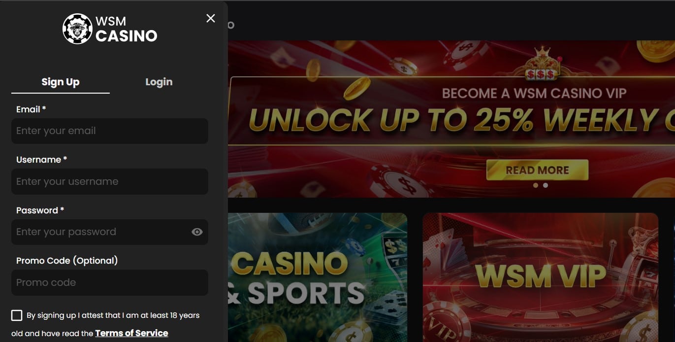 You become a WSM Casino member by clicking the black Sign-Up button in the top right corner of this hub’s homepage. Doing that makes a registration form emerge. It demands that you enter your email, input a username and password, and supply a referral code if you have one. Then, you must agree to the WSM general terms and service and hit Sign Up & Play. If you opt not to check the box that states you agree periodically to receive a marketing offer from this brand, you will get requested to make this choice again once your account has been created. Alternatively, you can join this website by signing up using WalletConnect.