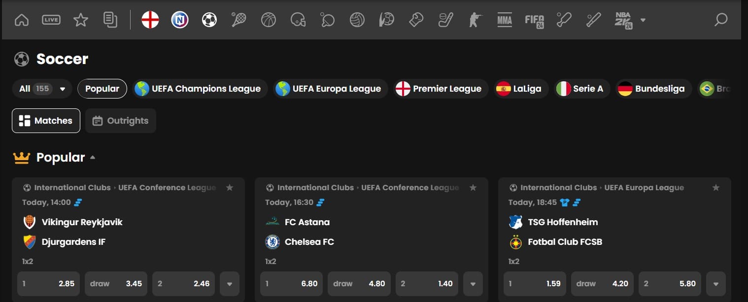 The sports you can bet on at this Internet bookie are Futsal, FIFA, MMA, Aussie Rules, Tennis, Ice Hockey, Basketball, Baseball, Handball, Volleyball, Boxing, Olympics, Rugby, Table Tennis, Penalty Shootout, Badminton, Bandy, Soccer, Snooker, and American Football. The eSports choices are eCricket, StarCraft, FIFA, Arena of Valor, Mobile Legends, Dota, eShooter, eTennis, Call of Duty, FIFA: Volta, Counter-Strike, eSoccer, eRocket League, Overwatch, eFighting, Penalty Shootout, King of Glory, League of Legends, NBA 2K, and StarCraft.
