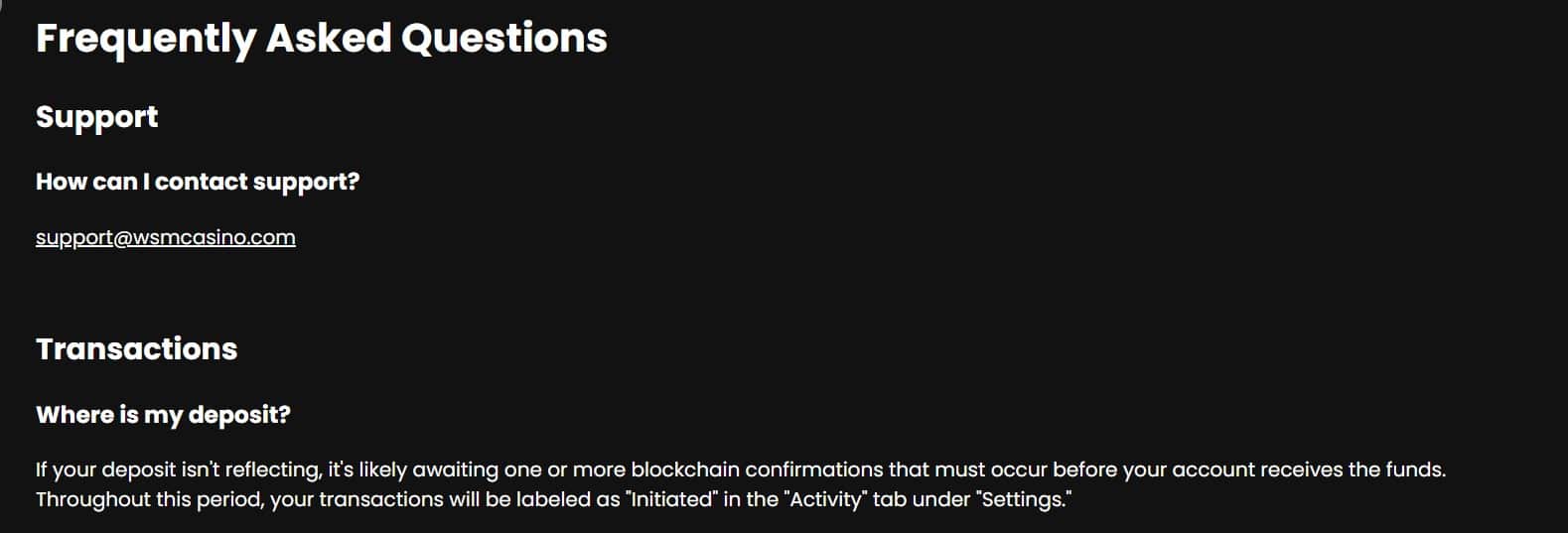 The site’s help email is support@wsmcasino.com, and the one reserved for complaints is complaints@wsmcasino.com. We tested the first one and got a reply to our five-question message within three hours. It was a satisfactory response. The WSM Casino FAQ page can be accessed using the help link in the homepage footer. It is payment info-oriented and will not provide much help regarding other topics.