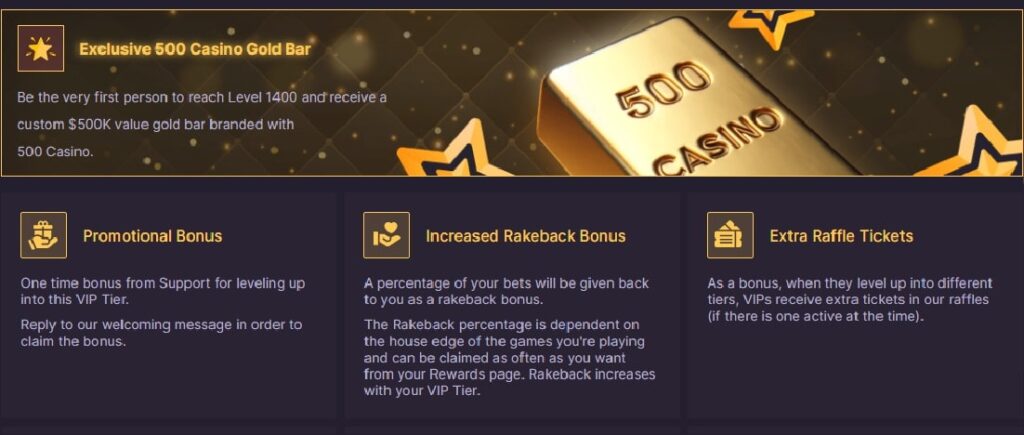 The 500 Casino VIP Club has 9,999 levels separated into ten tiers. We break down these in the list below: