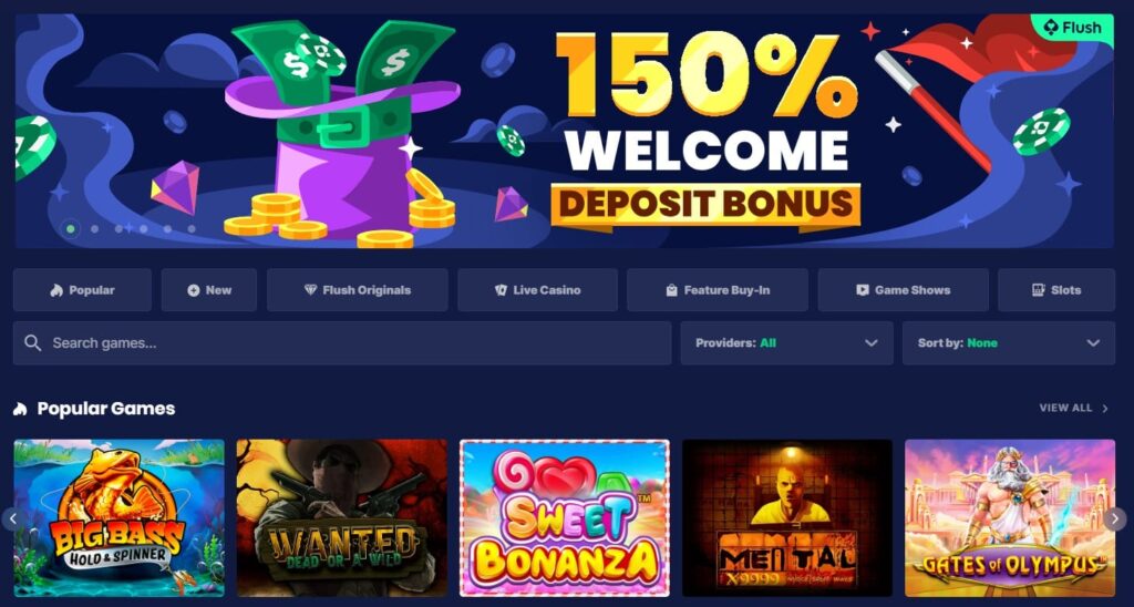 Flush Casino begrüßt neue Nutzer mit einem 150%igen Einzahlungsbonus.